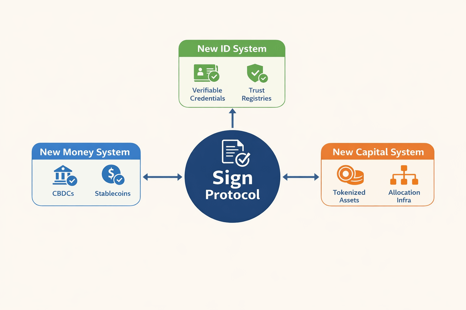 Aquela visão maior se torna mais clara quando você observa como o sistema é estruturado. S.I.G.N. organiza o problema em três sistemas conectados: o Sistema de Novo Dinheiro, o Sistema de Nova Identidade e o Sistema de Novo Capital. No papel, eles parecem ser verticais separados. Mas os documentos continuam apresentando-os como partes interdependentes de uma única pilha de infraestrutura. O Sistema de Novo Dinheiro abrange CBDCs e stablecoins regulamentadas em uma única linha nacional. O Sistema de Nova Identidade lida com credenciais verificáveis, registros de confiança, verificações de status e verificação offline. O Sistema de Novo Capital abrange distribuição, programas tokenizados e infraestrutura de alocação. O que eu gosto aqui é que S.I.G.N. não está fingindo que as economias modernas funcionam em caixas isoladas. Está mostrando que dinheiro, identidade e capital devem ser coordenados por meio de regras compartilhadas e evidências compartilhadas.