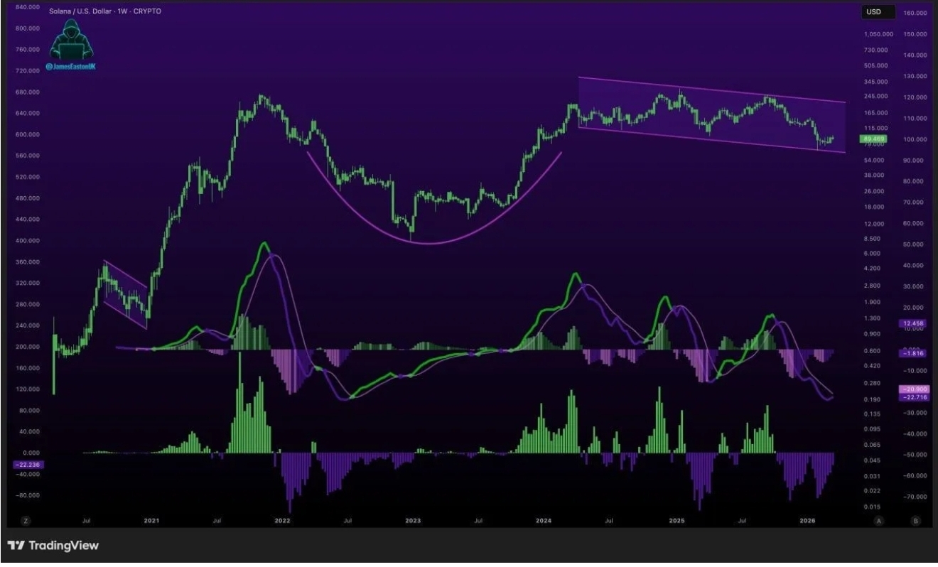 Um gráfico compartilhado por James Easton mostra a Solana se movendo dentro de um canal descendente após uma recuperação mais ampla. Indicadores de momentum abaixo do preço sugerem que a pressão de baixa pode estar diminuindo. Esta configuração combina uma base arredondada com uma fase de consolidação, um padrão que muitas vezes se forma quando um ativo está fazendo uma pausa antes de um potencial movimento maior.