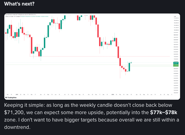 Na semana passada, discutimos que o Bitcoin teve um forte fechamento semanal acima de $71.300, e enquanto o preço mantivesse esse nível, poderíamos esperar um movimento em direção a $77K–$78K. O preço subiu para $76K, ficando apenas $1.000 abaixo da nossa meta. Eu não quero chamar isso de uma vitória, já que não atingiu totalmente a meta lol.
