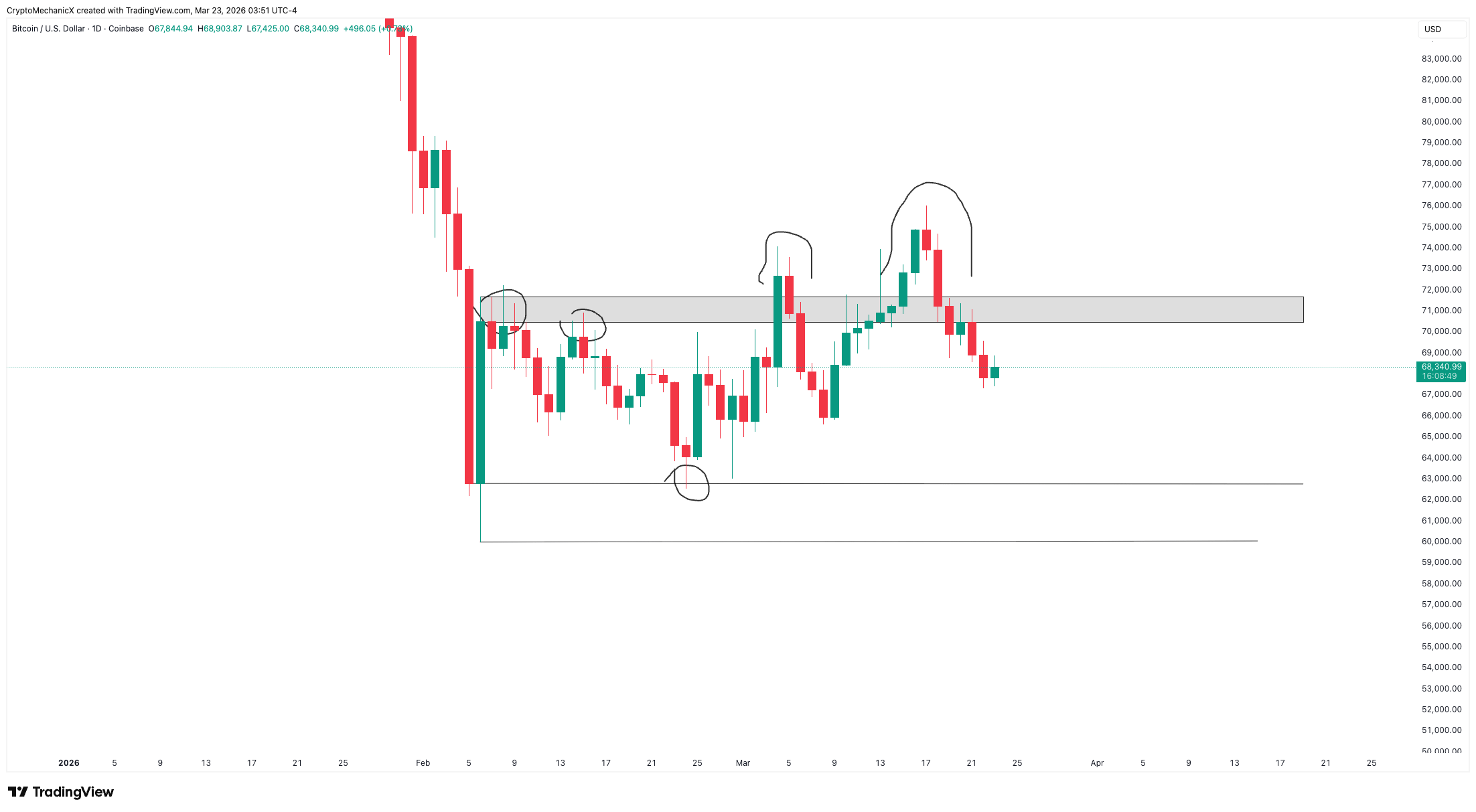 Pessoalmente, se eu quiser comprar Bitcoin, esperaria o preço recuperar $71,300 ou cair de volta para os pontos baixos da faixa. Não vou negociar entre isso porque nada está claro.