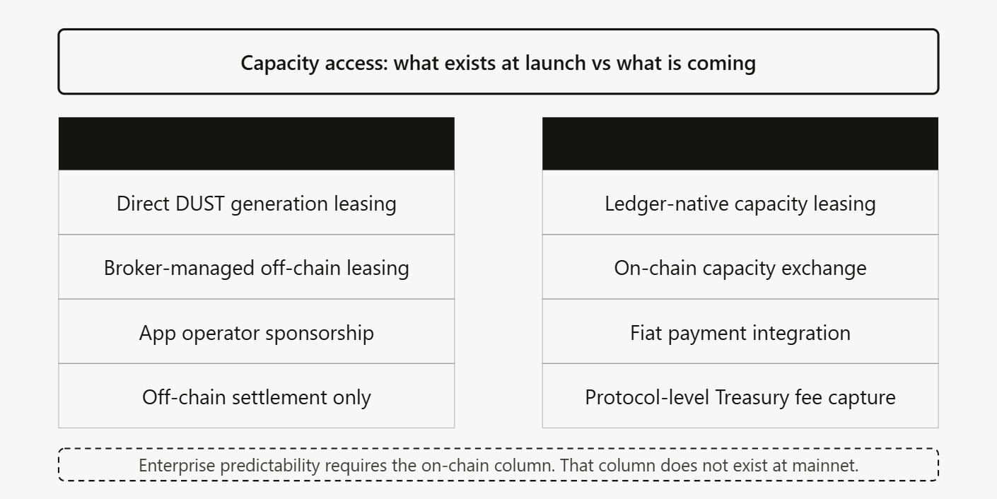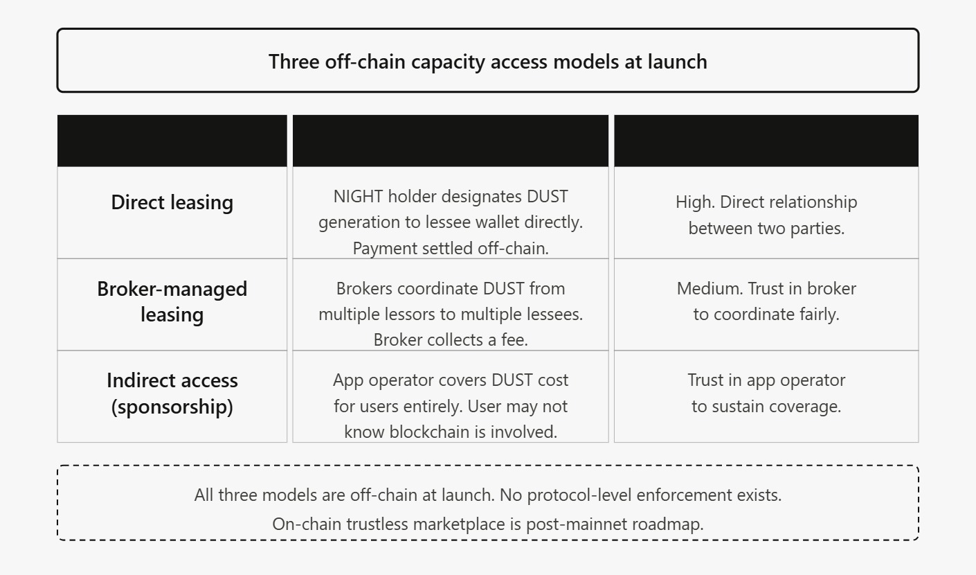 at launch, every capacity access model outside of direct night ownership depends on off-chain arrangements. a business building on midnight today that doesnt hold night is dependent on the existence and reliability of brokers, lessors, and operators who have voluntarily built these arrangements.