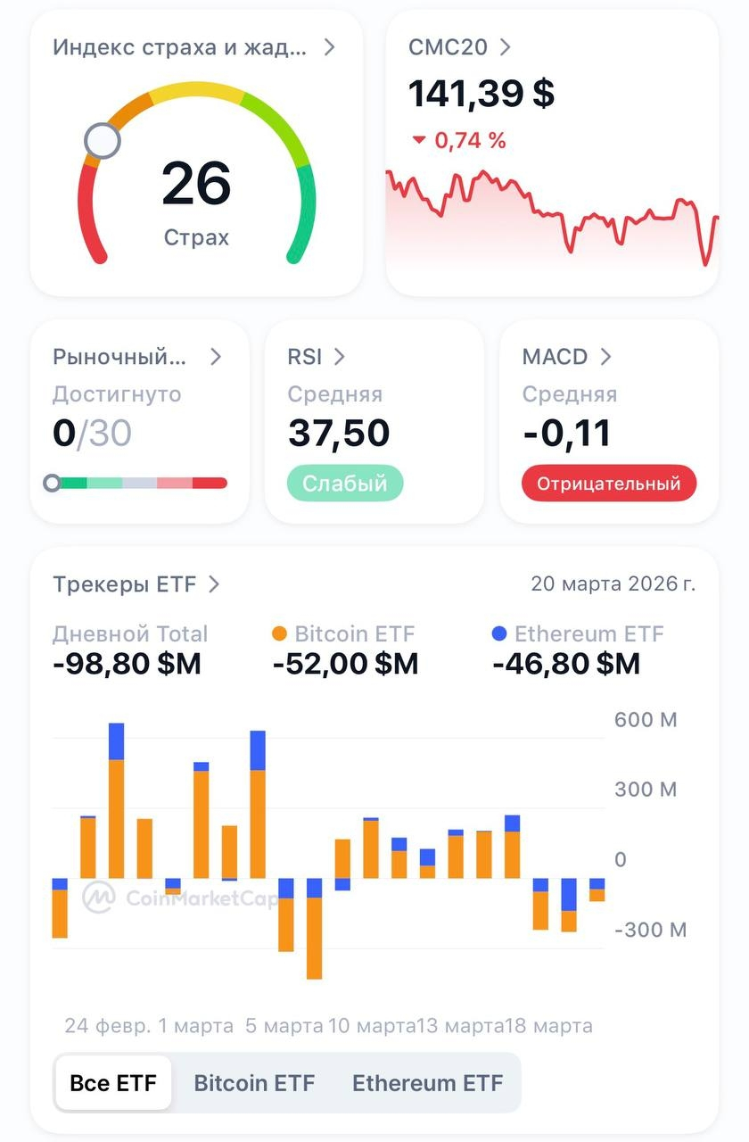 2. Отток из ETF развернулся. После трёх недель притока 17 марта спотовые биткоин ETF зафиксировали 163 млн оттока, а 19 марта ещё 90 млн. Институционалы взяли паузу .