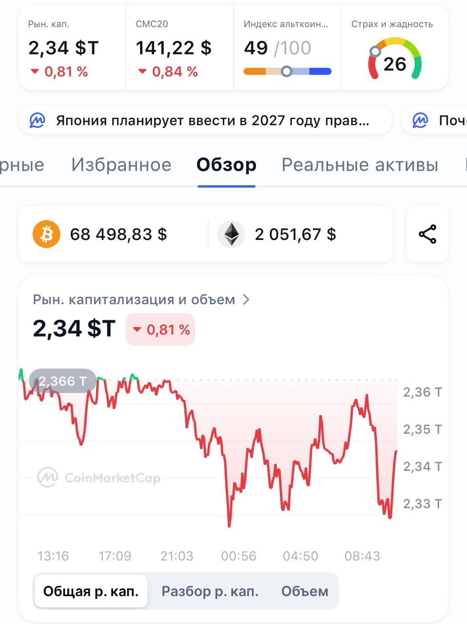 • Биткоин за выходные снизился больше чем на 3% и торгуется в районе 68 00 68 500 . За прошлую неделю BTC потерял около 10% после попытки закрепиться выше 75 000 .