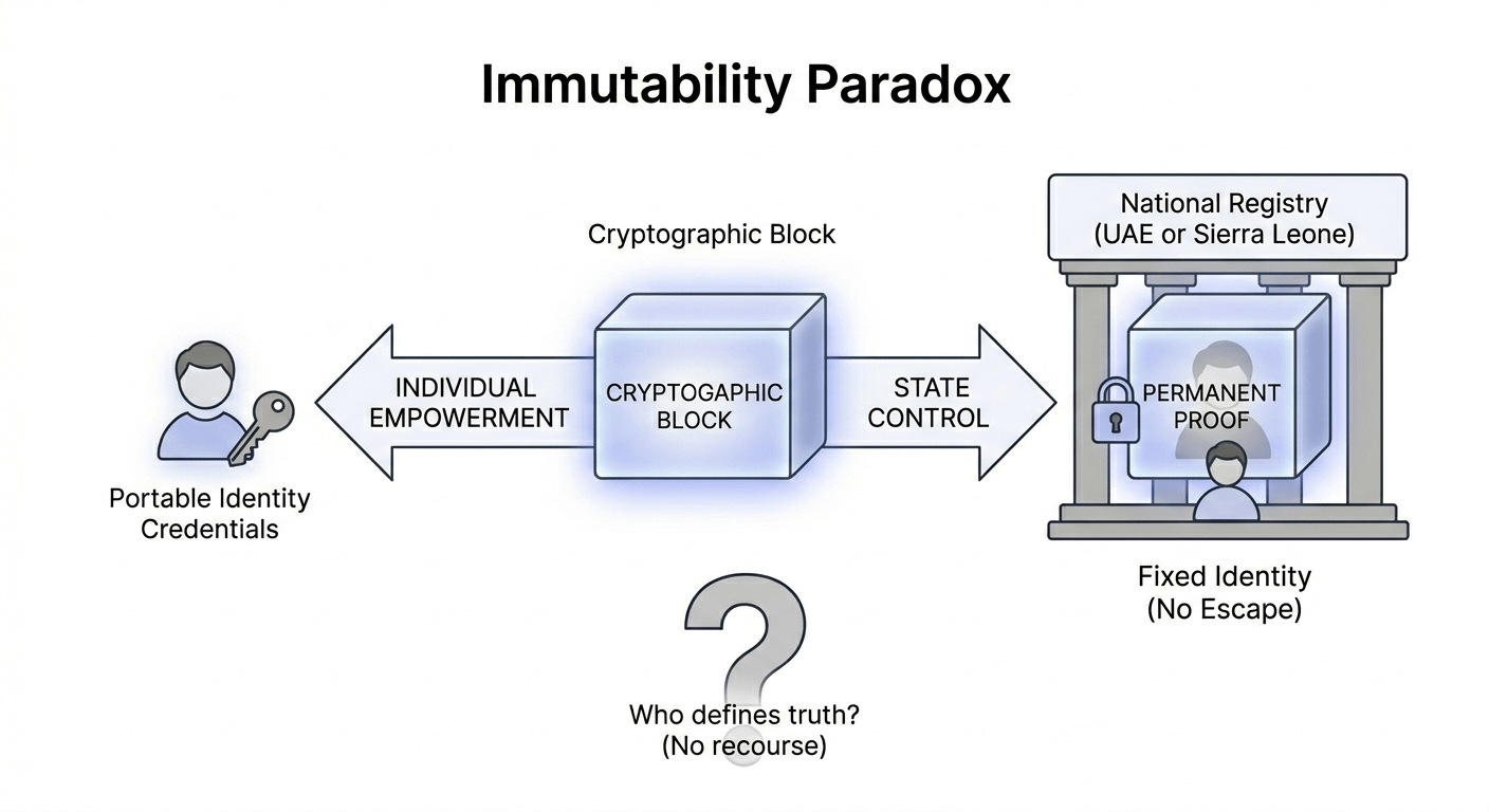 A parte honesta à qual continuo voltando é que a imutabilidade corta dos dois lados. Um sistema que garante prova permanente não faz distinção entre empoderamento e controle. A mesma infraestrutura que permite que um indivíduo possua suas credenciais sem depender de uma corporação também pode permitir que um estado fixe a identidade de maneiras que são difíceis de escapar. Com conselheiros como Balaji Srinivasan e dezenas de milhões em financiamento por trás, a intenção é claramente ambiciosa, mas o capital não resolve a assimetria entre quem escreve os dados e quem é definido por eles. Se algo, isso acelera quão rapidamente essa assimetria se torna real.