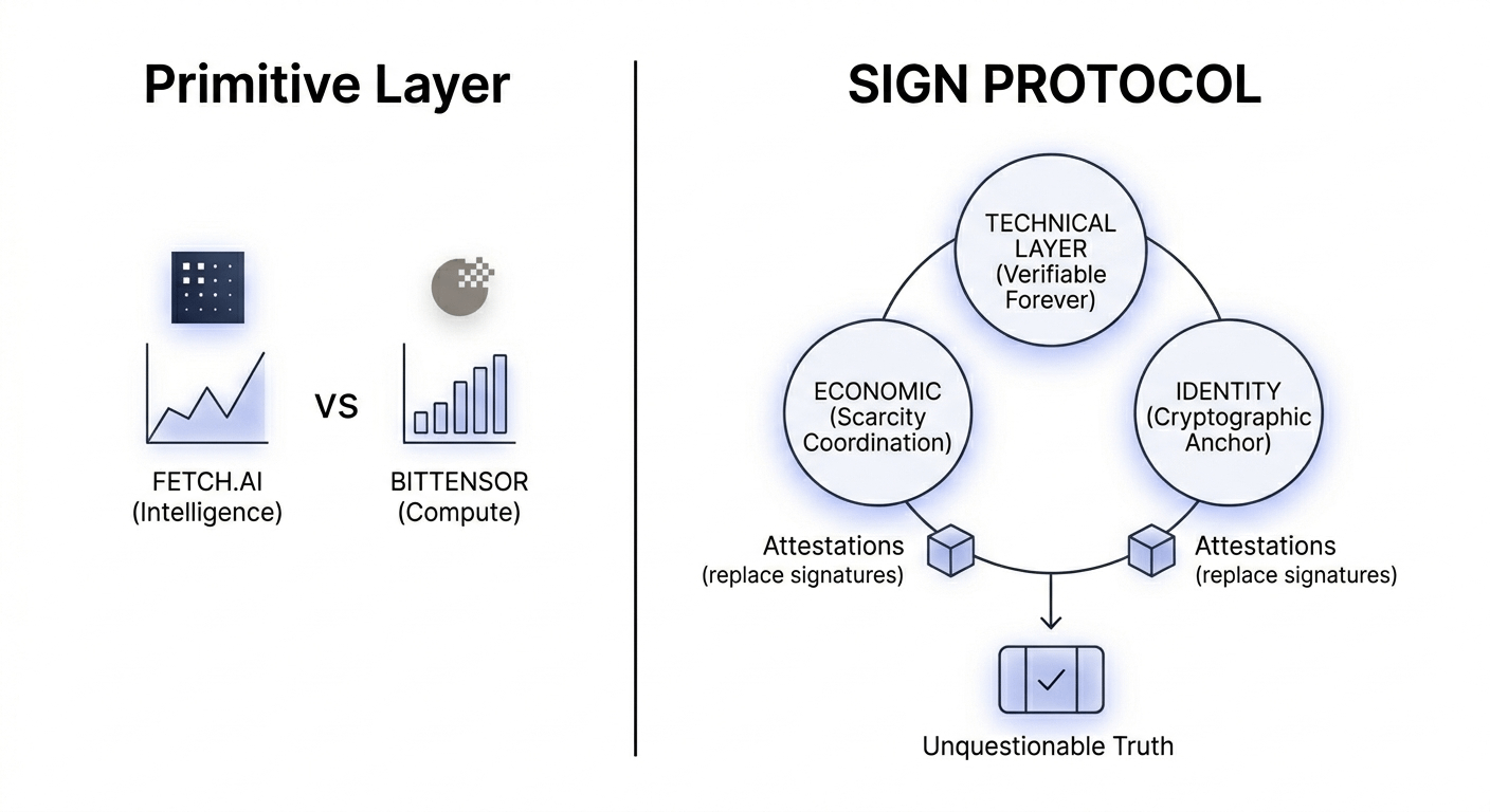 O contraste que ficou comigo é como isso se sente diferente de projetos como Fetch.ai ou Bittensor. Esses sistemas estão otimizando inteligência, coordenação ou criação de valor movida por máquinas. A SIGN está operando em um nível mais primitivo. Não está tentando ser mais inteligente ou mais rápida; está tentando ser indiscutível. Está competindo sobre quem pode definir o que é aceito como verdade em um ambiente digital. Esse é um domínio muito mais pesado do que mercados de computação ou dados, e carrega consequências que não aparecem em painéis.
