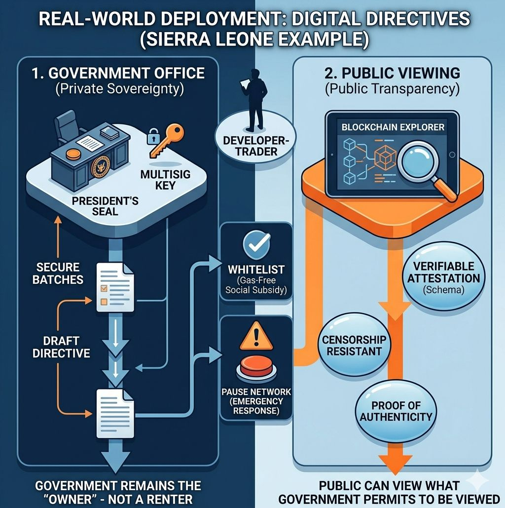 Hãy nhìn vào Sierra Leone nơi Sign thực sự đã triển khai hạ tầng xác thực cho các sắc lệnh của Tổng thống (Executive Directives). Đây không còn là kịch bản giả định. Mọi sắc lệnh đều được 'attest' qua giao thức của Sign. Chính phủ giữ quyền chủ động phê duyệt nội bộ (Sovereign Layer), trong khi công chúng có thể kiểm tra tính nguyên bản trên blockchain công khai (Public Layer). Nó chứng minh rằng: Blockchain không lấy đi quyền ban hành của nhà nước, nó chỉ 'đóng băng' sự thật đó lại để không ai có thể chối bỏ.