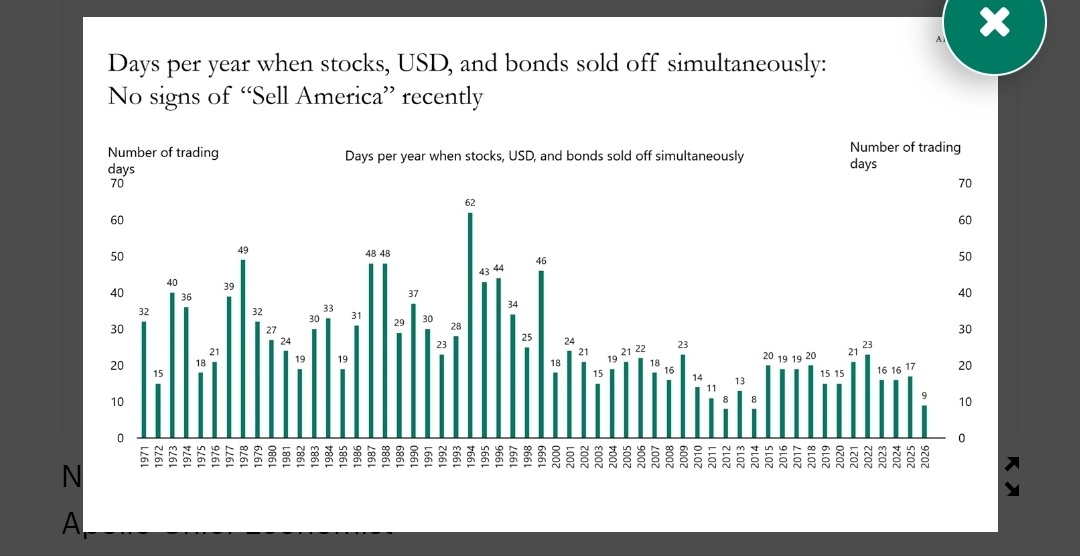 O comércio “Vender América”, ou seja, o comércio em que os preços das ações, títulos e do dólar dos EUA caem ao mesmo tempo. Mas contar o número de dias em que isso aconteceu não mostra sinais de que 2025 e 2026 serão algo especial. Na verdade, o gráfico abaixo mostra que não houve um comércio “Vender América” particular nos últimos 25 anos.