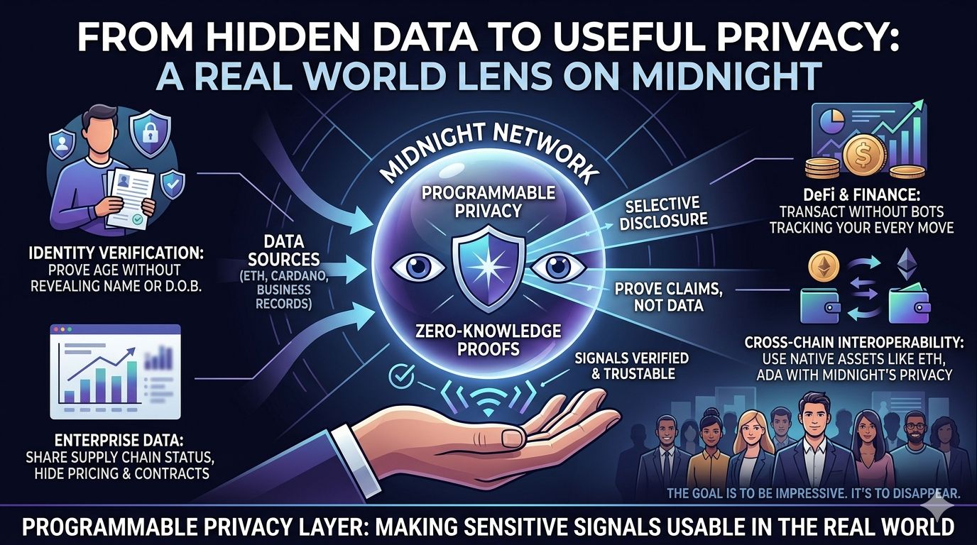 De acordo com o design do projeto, a Meia-Noite aborda esse problema combinando privacidade com divulgação seletiva. Em vez de forçar os usuários a revelar todos os dados ou esconder tudo, ela permite que informações específicas sejam provadas sem expor os detalhes subjacentes. O protocolo usa tecnologia de conhecimento zero para separar o que é verdadeiro do que é visível, significando que um usuário pode provar que uma condição é atendida sem revelar dados completos. Por exemplo, se um serviço requer prova de idade, em vez de enviar documentos de identidade completos ou expor informações sensíveis na cadeia, um usuário pode simplesmente provar que atende ao requisito sem revelar detalhes exatos. Isso muda como os dados são tratados, mudando de coleta para exposição controlada. Em um nível de sistema, isso requer coordenação entre contratos inteligentes, camadas de identidade e provas criptográficas, ao mesmo tempo que empurra os desenvolvedores a projetar aplicações que solicitam apenas os dados necessários. O resultado não é apenas um recurso, mas uma abordagem diferente para construir sistemas digitais.