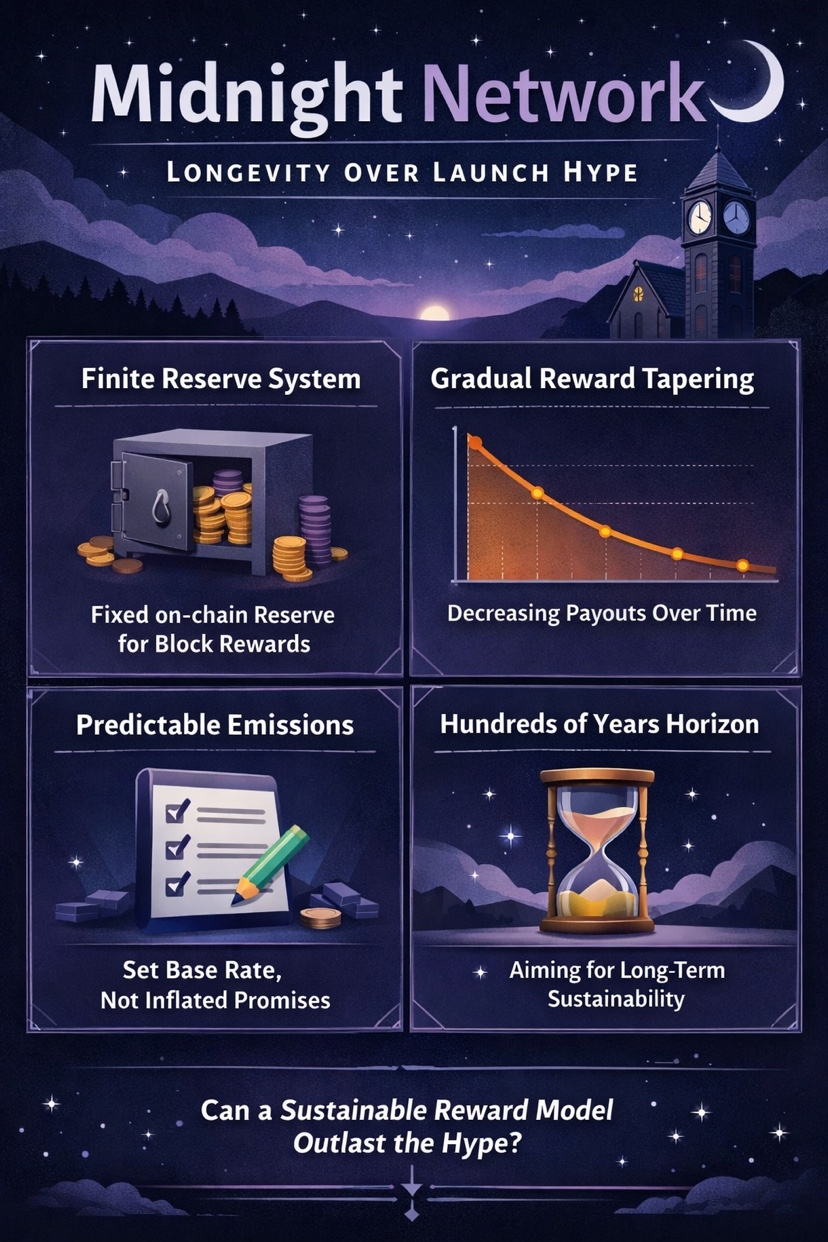 Isso parece simples, mas a escolha de design importa. A maioria das pessoas ouve “recompensas futuras mais baixas” e assume fraqueza. Eu acho que a pergunta mais séria é se uma rede deve prometer mais do que sua própria estrutura pode razoavelmente sustentar. O Midnight está moldando a resposta de maneira diferente. Seu whitepaper diz explicitamente que esse padrão de redução pode fazer a Reserva durar por um longo tempo, na ordem de centenas de anos na prática, dependendo da alocação inicial. Essa não é a linguagem de uma cadeia tentando vencer o primeiro ciclo com emissões chamativas. É a linguagem de uma cadeia tentando tornar a produção de blocos legível e durável ao longo de um longo horizonte.