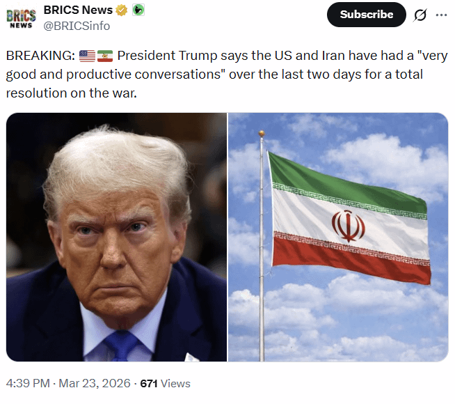 De acordo com @BRICSinfo, o presidente Trump confirmou que os EUA e o Irã mantiveram um diálogo construtivo nos últimos dois dias, com discussões focadas em uma resolução total do conflito em andamento. A declaração imediatamente mudou o sentimento do mercado de aversão ao risco para apetite ao risco — os ativos cripto subiram, os preços do petróleo diminuíram e as posições vendidas alavancadas foram agressivamente apertadas em toda a extensão.