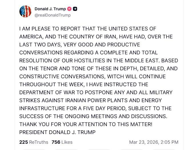 “As negociações com o Irã são produtivas. Adiaremos os ataques por 5 dias”.