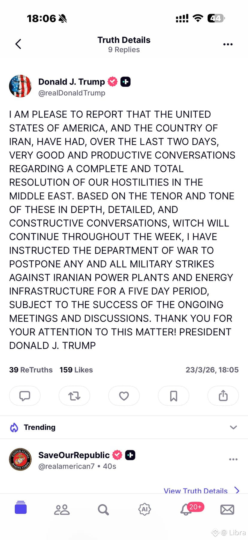 Trong một thông báo mới nhất trên mạng xã hội Truth Social vào chiều tối ngày 23/3/2026, Tổng thống Donald J. Trump đã công bố những tiến triển bất ngờ trong quan hệ ngoại giao giữa Hoa Kỳ và Iran.