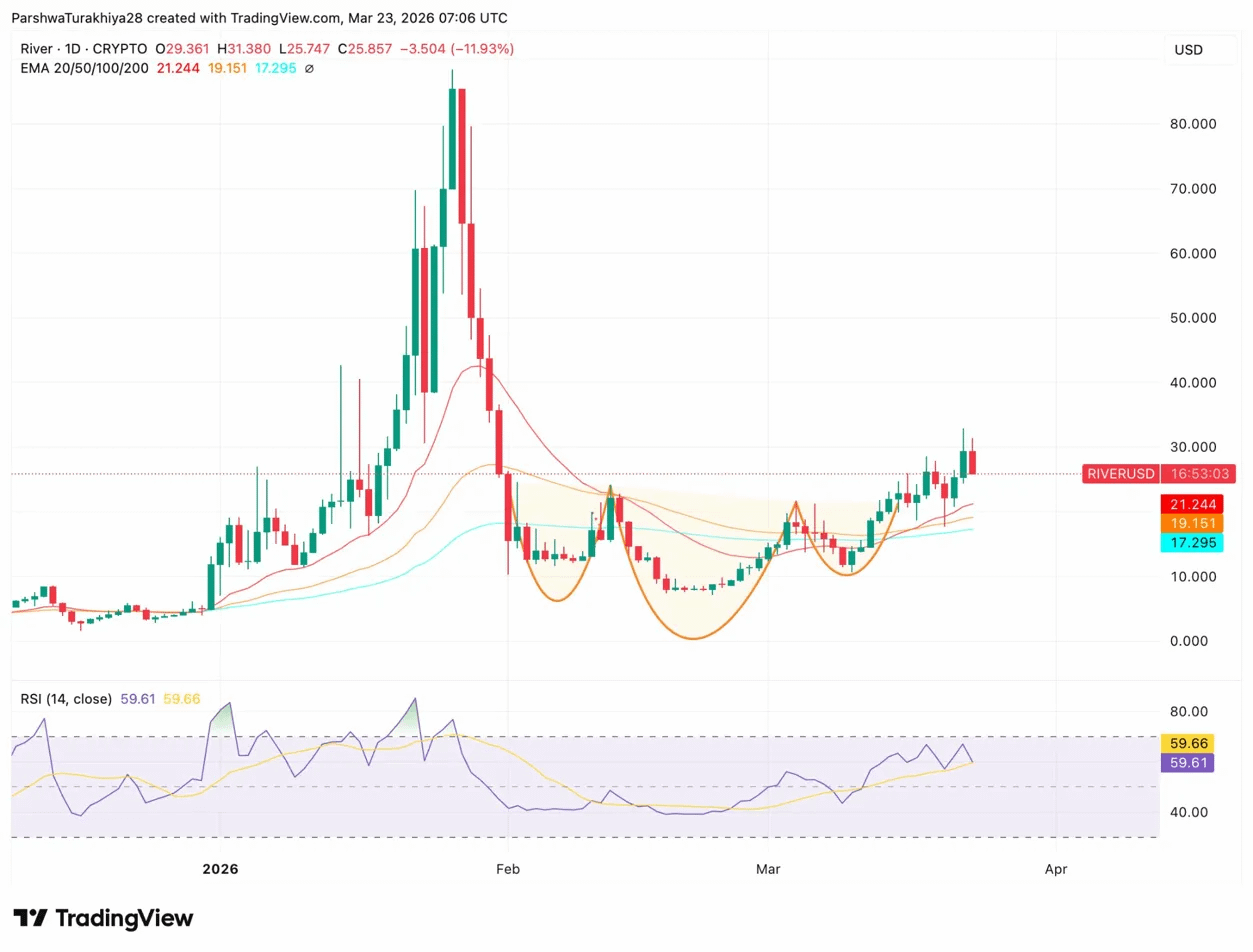 River subiu mais de 20% ontem para $31,38, classificado entre os 100 maiores ganhadores diários no crypto, e depois devolveu a maior parte desses ganhos esta manhã. Agora está sendo negociado a $25,857, uma queda de 11,93%. Esse tipo de movimento de dois dias, subindo 20% e depois caindo 12%, é típico para um token de média capitalização com oferta circulante limitada e volume impulsionado por momentum. O gráfico agora está em um ponto de decisão.
