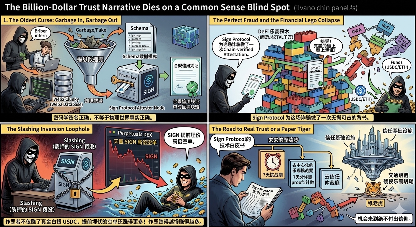 Sign试图用纯粹的链上逻辑去解决复杂的链下信任问题,这本质上是一种技术傲慢。随着他们接入的数据源越来越庞杂从IoT设备数据到推特社交图谱,数据的脆弱性呈指数级上升。只要源头的一行代码被污染,整个链上下游的DeFi乐高就会瞬间坍塌。