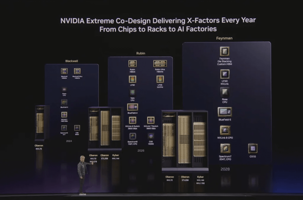 Feynman(下一代):全新 GPU,LP40 芯片(由英伟达与 Groq 团队联合打造,集成 NVFP4);全新 CPU——Rosa(Rosalyn);BlueField 5;CX 10;同时支持铜缆和 CPO 两种扩展方式的 Kyber 机架