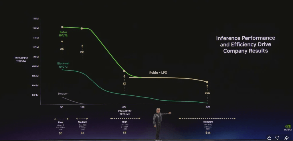 黄仁勋强调英伟达的架构能够让客户在免费层实现极高的吞吐量,同时在最高价值的推理层级上,将性能提升惊人的 35 倍。
