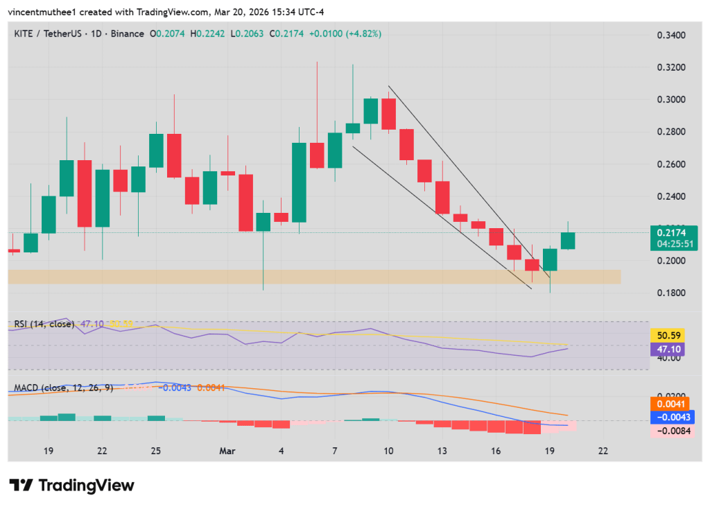 Kite (KITE) está de volta aos holofotes mais uma vez após um impressionante aumento de preço na sexta-feira. Esta criptomoeda subiu 5,7% até o momento da redação, sendo negociada a $0,2174. A recente ação de preço mostra que o Kite está rompendo o padrão gráfico de triângulo descendente.