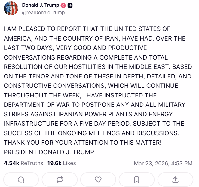 Trump foi mais longe — instruindo explicitamente o Departamento de Defesa a adiar todos os ataques militares em usinas de energia iranianas e infraestrutura energética por cinco dias, citando o tom positivo das conversas em andamento que ele disse que continuariam ao longo da semana.