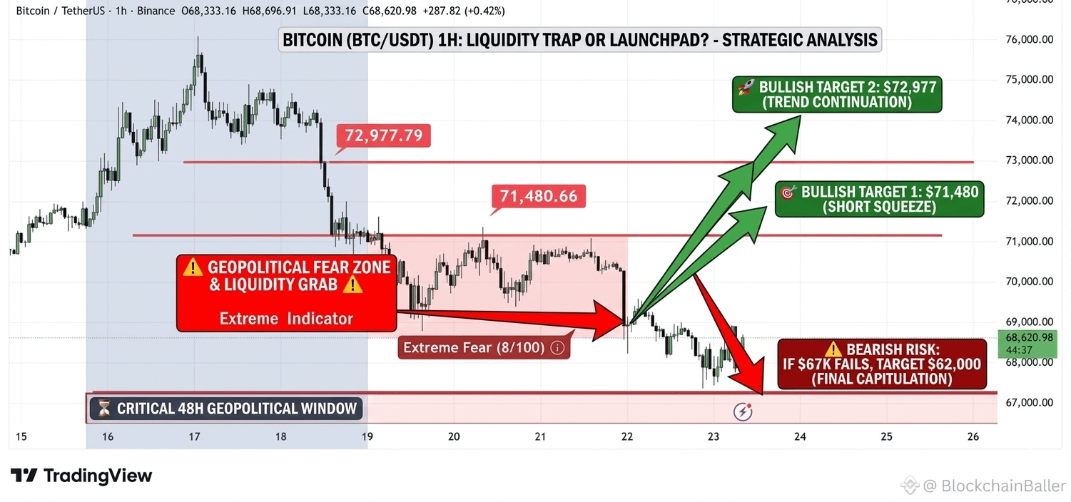 O mercado está atualmente alimentado por uma leitura de "Medo Extremo" (Índice em 8/100), um nível que historicamente sinaliza um fundo estrutural. Enquanto o conflito no Oriente Médio causou um breve colapso para $67,371, a recuperação em direção a $68,600+ sugere que os touros ainda não terminaram.
