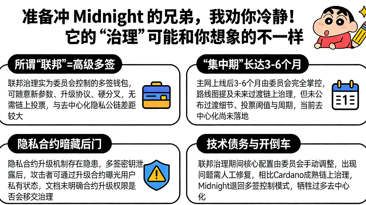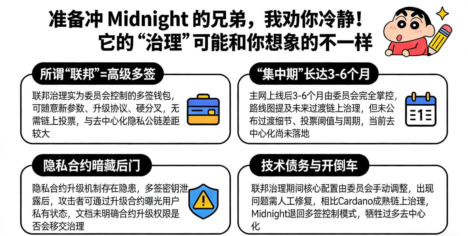 Outra coisa que me incomoda: durante o período de governança federal, parâmetros essenciais como o tamanho do bloco e os parâmetros do livro-razão são todos ajustados manualmente pela comissão. Isso significa que, se um parâmetro for definido incorretamente, ainda dependeremos de "humanos" para apagar o fogo. Comparando com a governança em cadeia madura da Cardano, o Midnight, como Partner Chain, na verdade retrocedeu para o antigo caminho de "multi-assinatura governando o mundo". Eu entendo a necessidade de sacrificar a descentralização para iniciar a estabilidade, mas isso é um sacrifício excessivo.