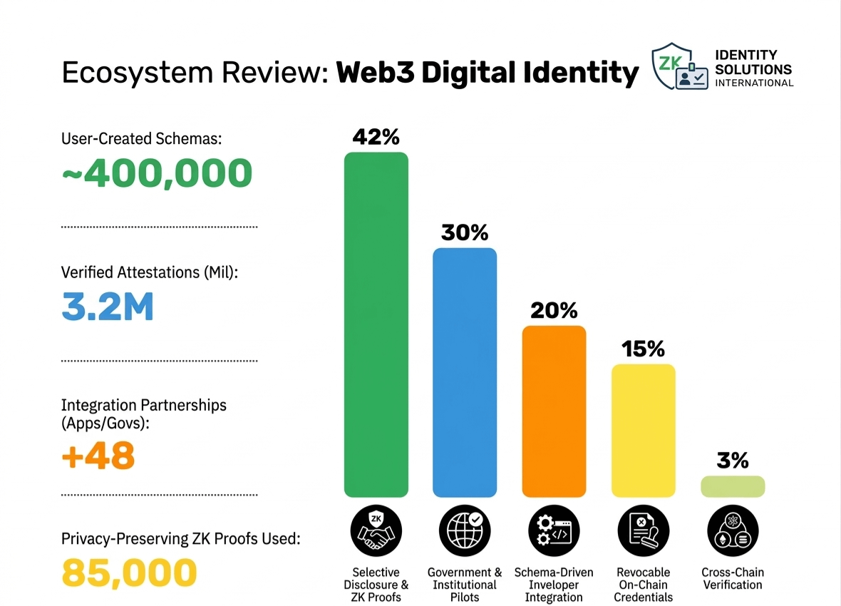 Os esquemas cresceram para cerca de 400000 em 2024 e as atestações atingiram milhões com um rápido aumento ao longo do tempo. Isso é importante porque muitos projetos de identidade cripto nunca vão além dos testes. Eles permanecem pequenos ou experimentais.
