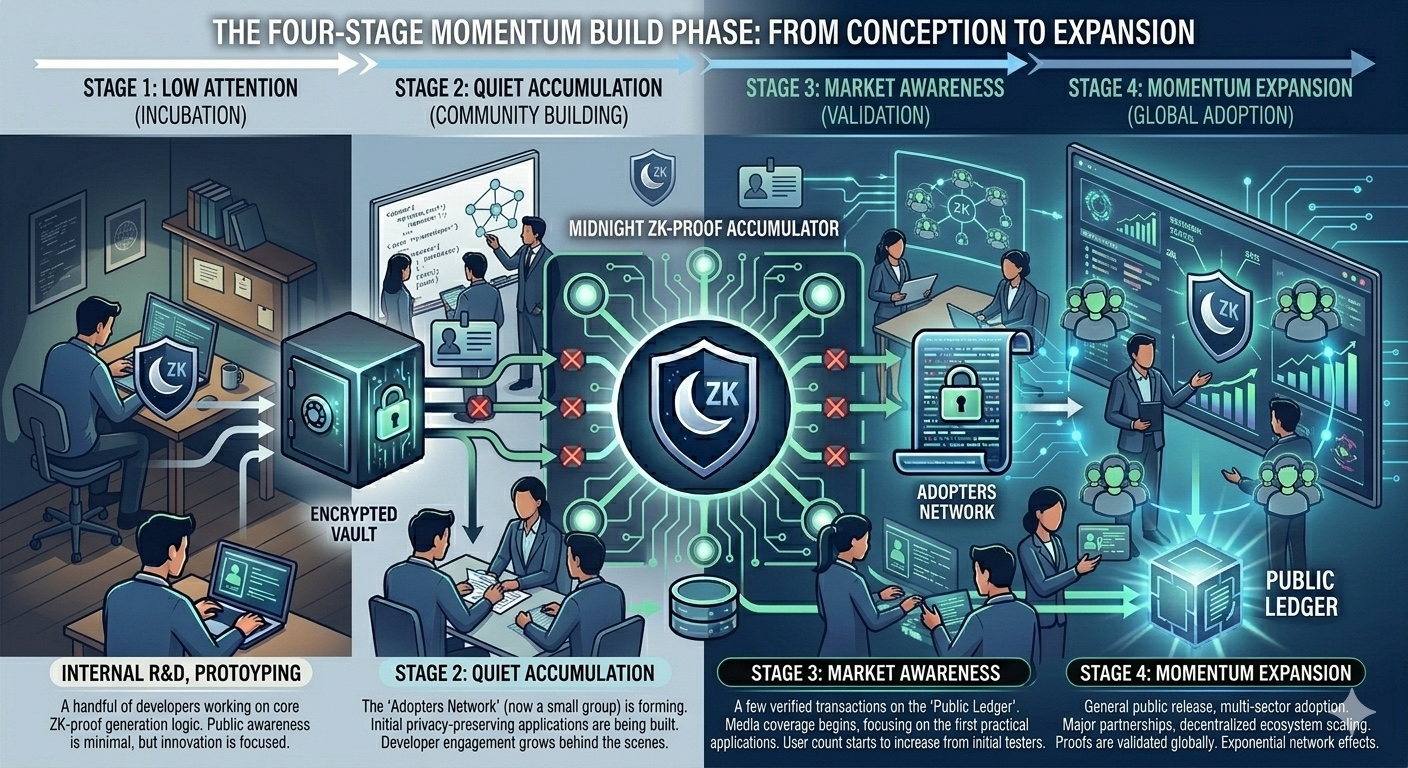 A atividade se constrói em ciclos. A atenção aumenta em torno de anúncios, depois se estabiliza. A participação cresce, mas ainda não de uma maneira que sinalize uma integração profunda. Parece um sistema sendo avaliado em vez de um já embutido.