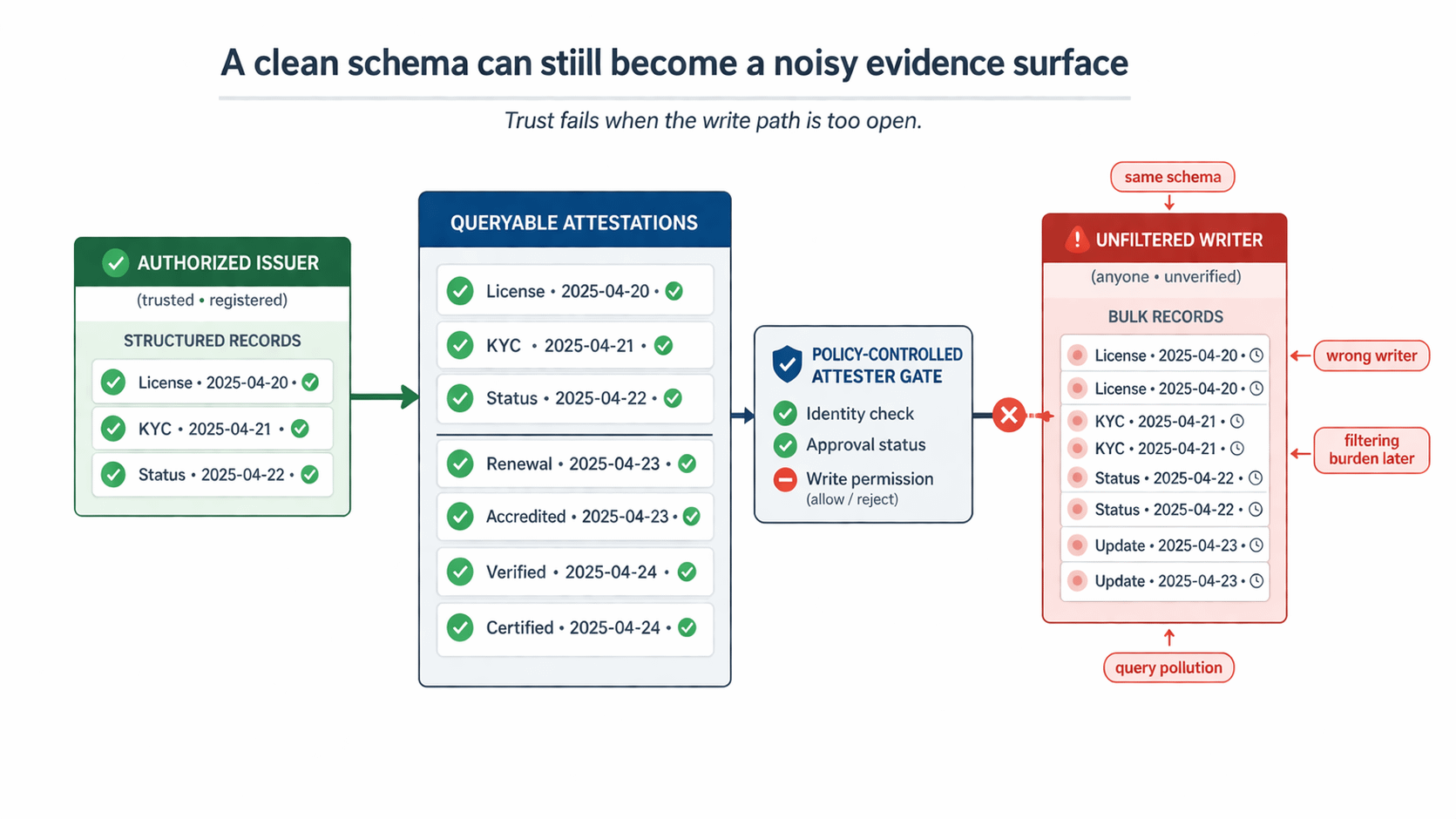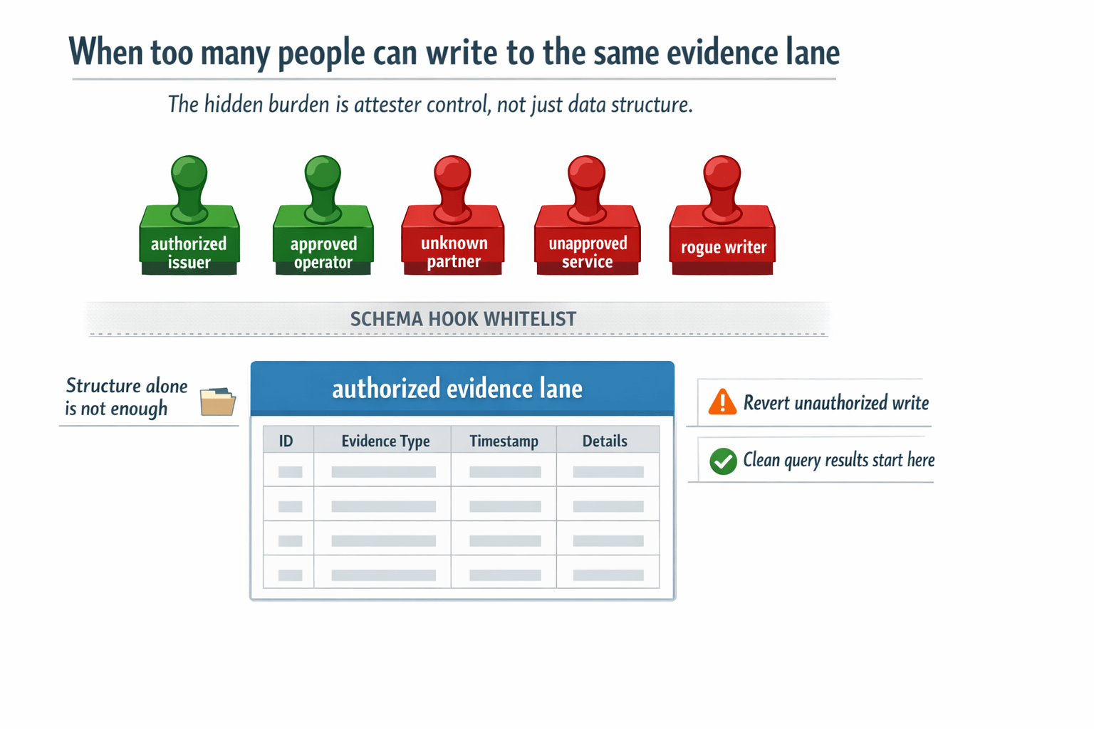That is why write-lane pollution feels worse to me than bad data. Bad data often announces itself. This does not. The record can look orderly, signed, and fully compatible with the schema. The hook was supposed to narrow the lane. The revert was supposed to stop the call. If that admission boundary stays loose, later operators are not using a trust layer. They are doing correction work inside something that still looks official.