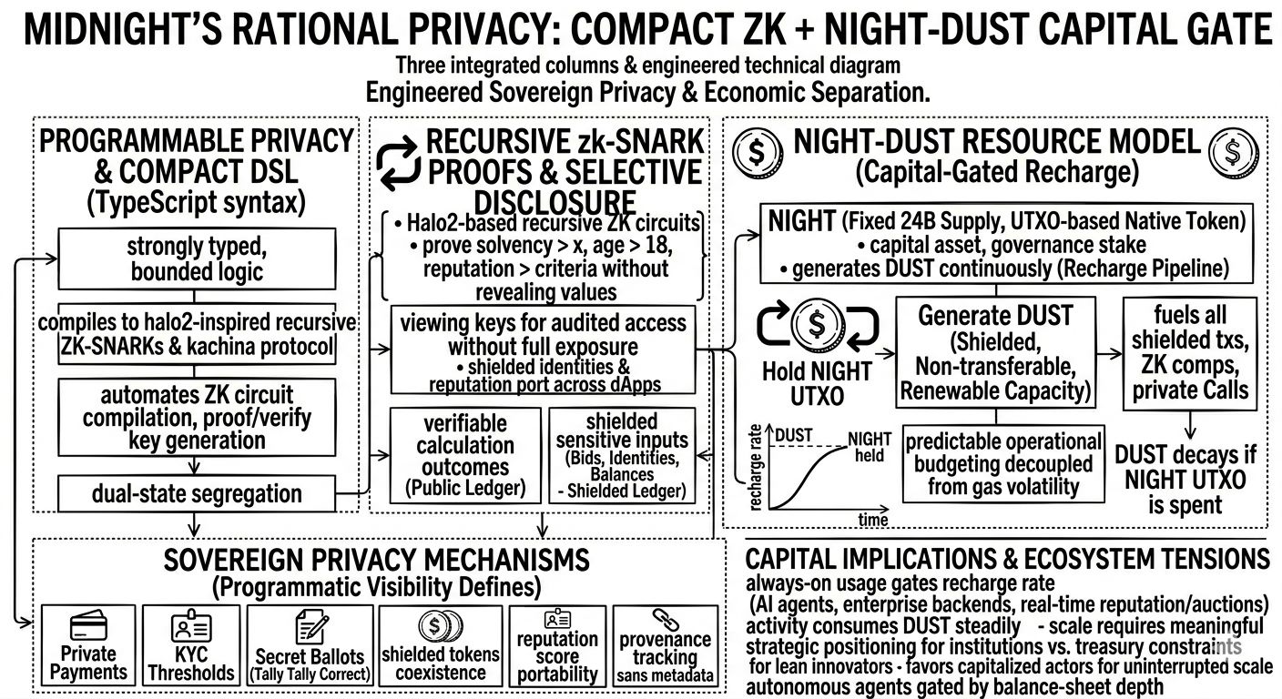That quietly reshapes accessibility. Technical sophistication (Compact abstraction, recursive zk-SNARKs, dual-state contracts, selective disclosure) enables powerful private apps. Economic model (NIGHT → DUST recharge) ensures predictability and spam resistance. Together they favor actors who can afford sustained exposure to the base asset. Well-capitalized players dominate uninterrupted scale; lean innovators face a "capitalize first" hurdle. AI-heavy or enterprise narratives amplify this: autonomous agents sound decentralized until their shielded activity is gated by balance-sheet depth.