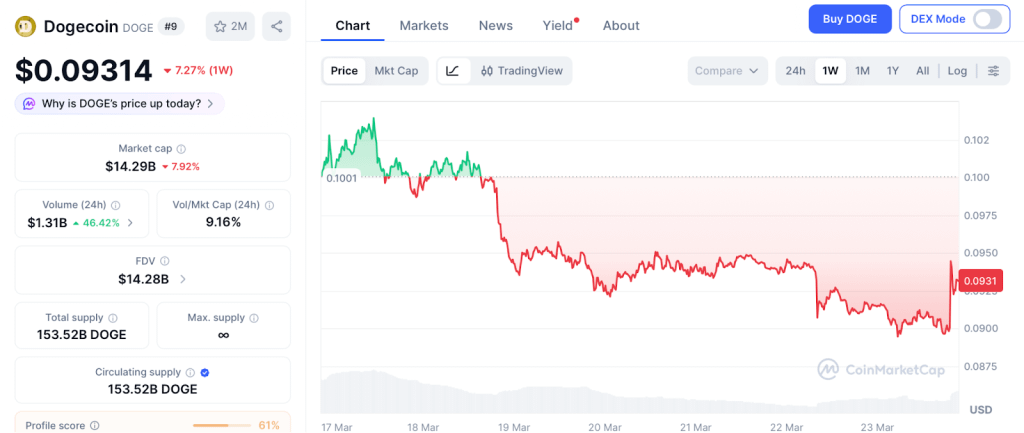 O DOGE é negociado perto de $0,093 em 23 de março, ficando 87% abaixo de sua máxima histórica de $0,73 em maio de 2021, de acordo com a CoinMarketCap. A comunidade de previsão de preço do dogecoin está dividida entre um alvo conservador de $0,22 e um teto otimista de $0,25 até o final do ano, ambos dependendo fortemente do engajamento social de Elon Musk e do sentimento mais amplo do ciclo de memes retornando.