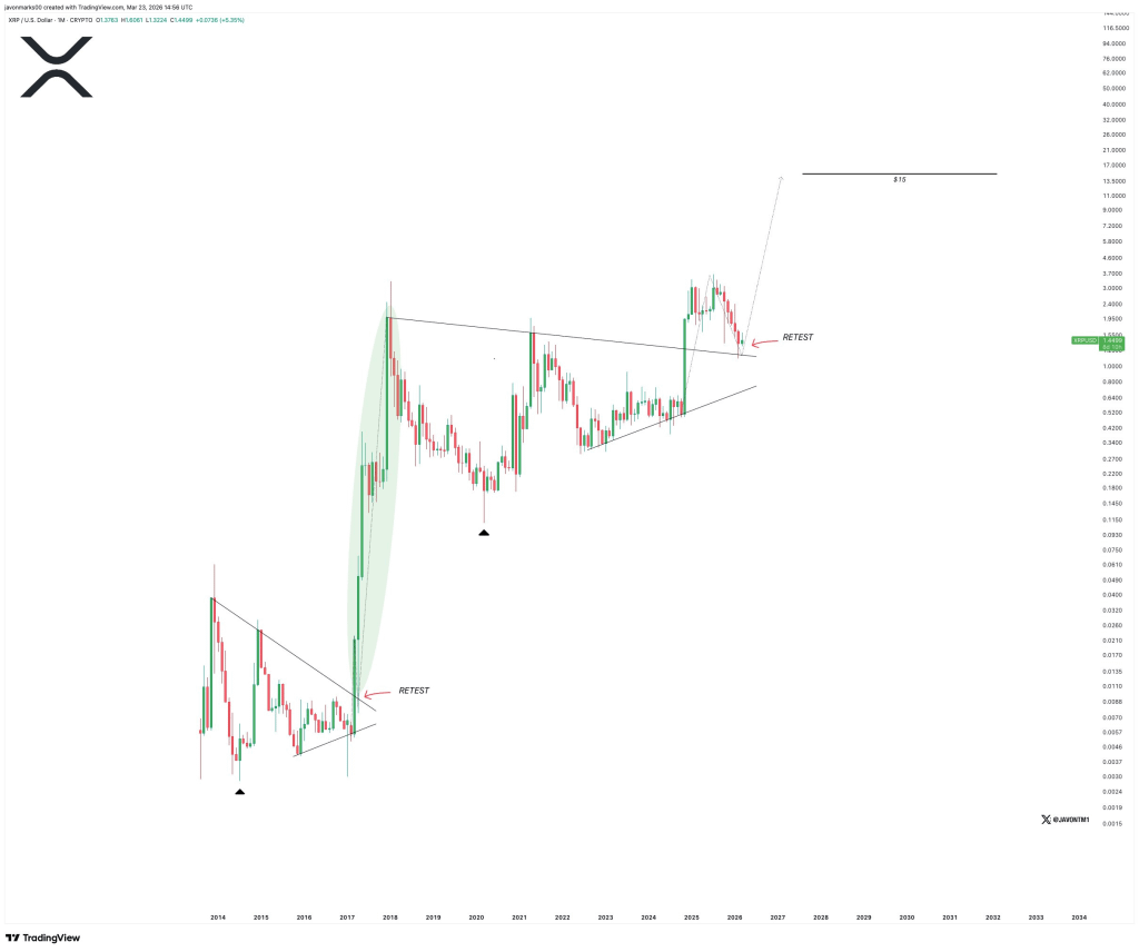 A zona alvo destacada é de $15 ou mais, que se alinha com extensões de Fibonacci de longo prazo e níveis de resistência histórica de ciclos anteriores. O analista observa que a configuração atual espelha a estrutura que precedeu o último grande rali do XRP, onde um reteste de ruptura semelhante levou a uma corrida sustentada de vários meses.