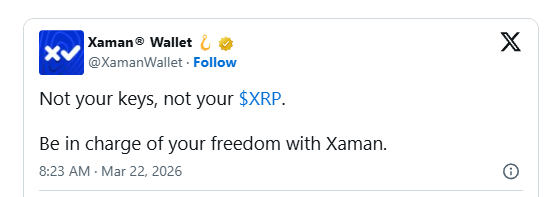 The latest reminder comes from Xaman Wallet, which issued a statement emphasizing self-custody practices for holders of XRP. The message reiterates a well-known phrase within the crypto community that highlights the importance of controlling private keys rather than relying on third-party platforms for asset storage.