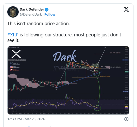 Crypto analyst Dark Defender reinforces this view in a recent post on X, arguing that XRP is following a well-defined market structure. He emphasizes that the asset’s movement aligns with a long-standing technical framework rather than random volatility, offering a more calculated interpretation of current price behavior.
