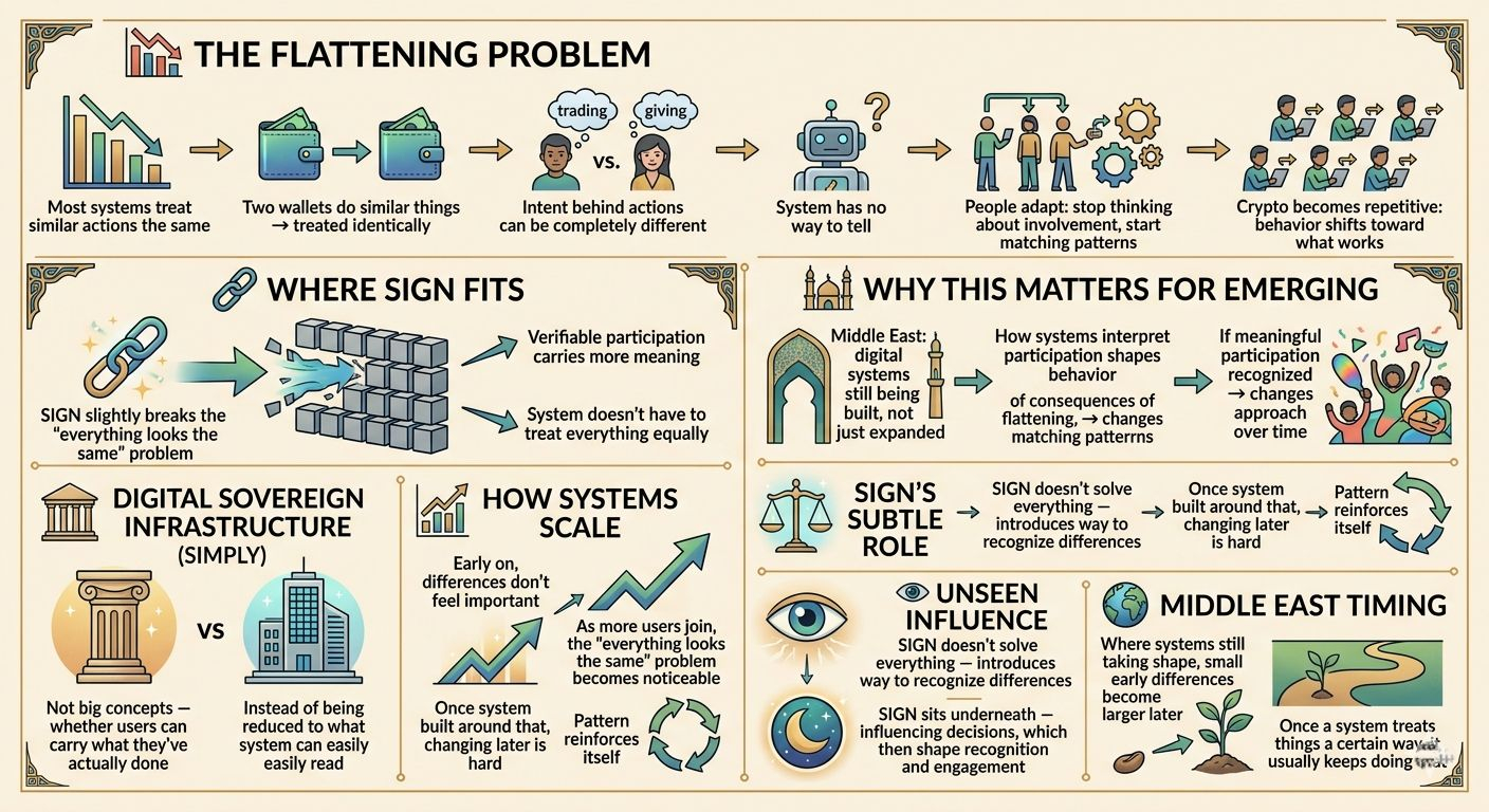 O SIGN começou a fazer mais sentido para mim quando olhei por esse ângulo. Não como algo tentando mudar tudo, mas como uma forma de quebrar ligeiramente aquele problema de "tudo parece igual". Se algumas partes da participação podem realmente ser verificadas de uma forma que carrega um pouco mais de significado, então o sistema não precisa mais tratar tudo igualmente. Não perfeitamente, mas melhor do que antes.