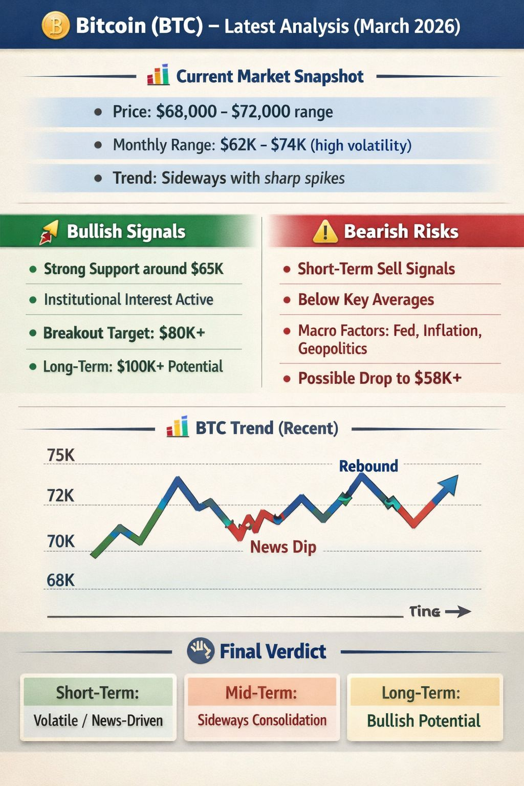 $SIGN (#SignOfficial )📊 Bitcoin Update: Market remains volatile between $68K–$72K with strong support near $65K. Short-term movements are news-driven, but institutional interest keeps long-term outlook bullish 🚀 A breakout above $74K could push toward $80K+, while downside risk remains near $58K ⚠️ Trade smart, manage risk, and watch key levels closely. 🪙 Sign – Latest Analysis (2026)