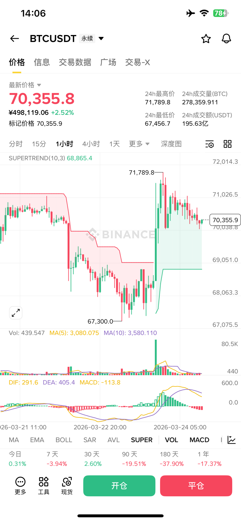 大饼这张图信息量很大。左边一大段红色下跌,从之前高位一路跌到67,300,中间几乎没有像样的反弹。右边这波拉升明显不一样,量能在突破时集中放出来,你看那根冲上71,789的大阳线,量柱是整段时间里最大的,这不是缩量骗人,是有资金在认真推。SuperTrend顺利翻绿,支撑68,865,现价70,355在支撑上方将近1,500刀。但MACD数据值得注意:DIF 291.6,DEA 405.4,MACD柱-113.8,DIF还在DEA下方,金叉还没形成,动能上还差一口气。冲到71,789之后回落到现在70,355,回撤将近1,400刀,量能也从高峰缩到439,后续能不能守住支撑是关键。