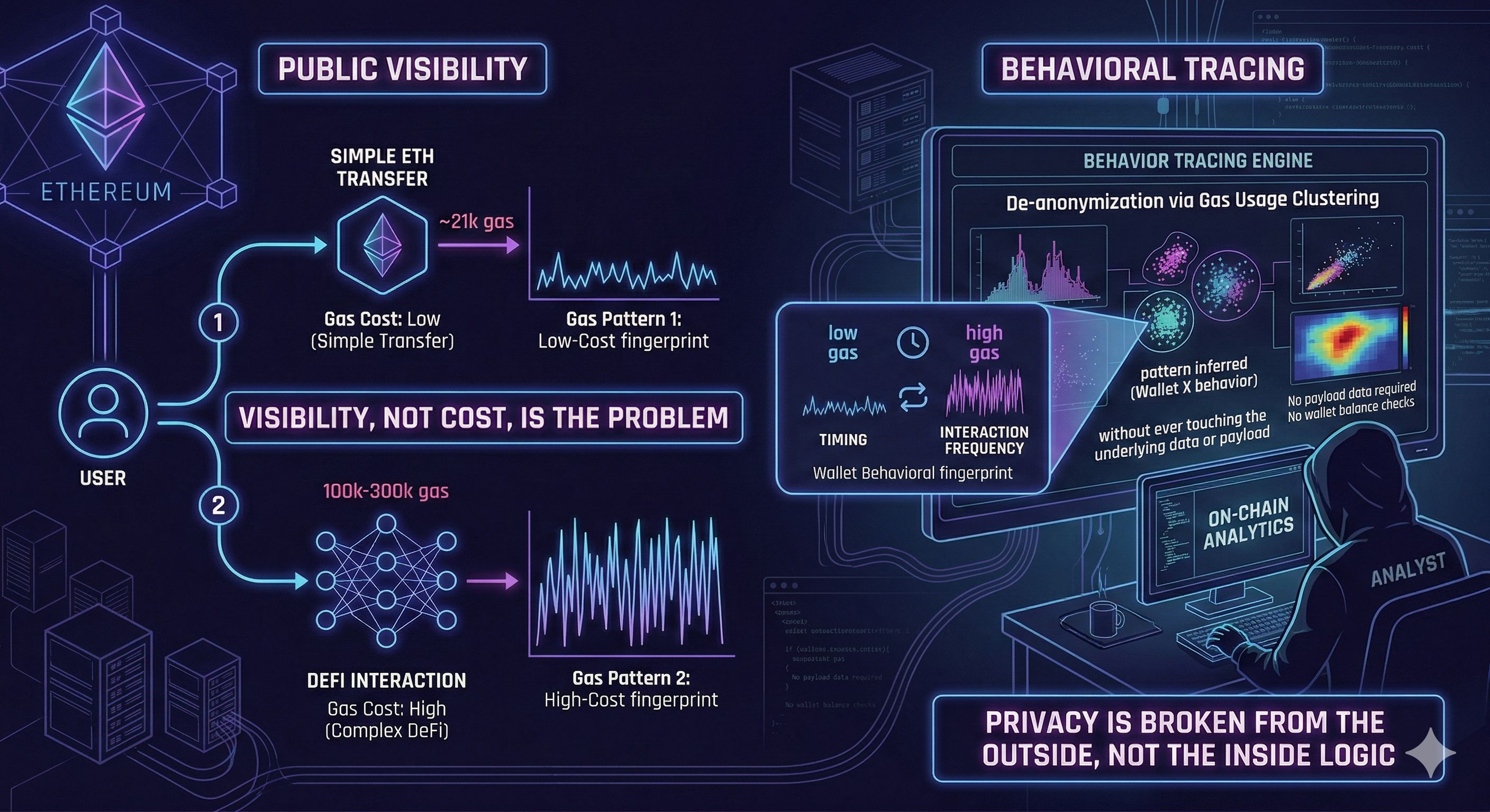 On Ethereum, a basic ETH transfer costs 21,000 gas. A typical DeFi interaction can range from 100,000 to 300,000 gas depending on complexity. That difference alone creates consistent fingerprints. Combined with timing and interaction frequency, these signals are commonly used by on-chain analytics to cluster wallets and infer behavior. No underlying data needed.