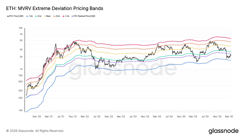 On the downside, failure to reclaim realized price could keep ETH exposed to a retest of the lowest deviation band near $1,651.