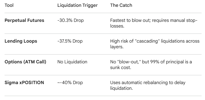 O valor das ferramentas de alavancagem não está apenas nos ganhos durante a alta, mas também na capacidade de sobrevivência durante a queda. Contratos perpétuos e ciclos de empréstimos muitas vezes levam a eventos de término (uma vez que a liquidação acontece, você sai completamente), enquanto o mecanismo de rebalanceamento da Sigma permite que a posição seja "reduzida" em vez de "desaparecer", preservando uma chance de recuperação do mercado.