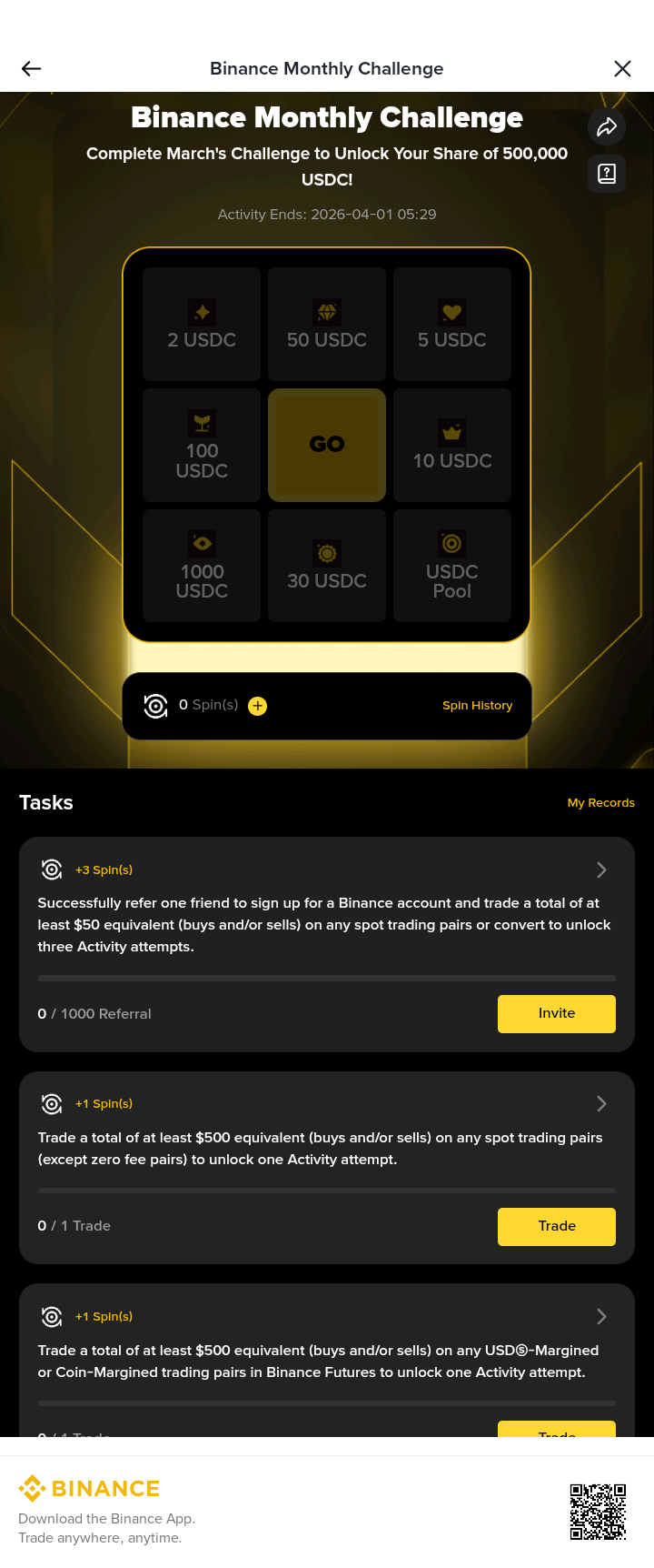 * Futures Trading Mission: Trade a total of at least $500 on any USDⓈ-M or Coin-M Futures pairs to unlock 1 spin.