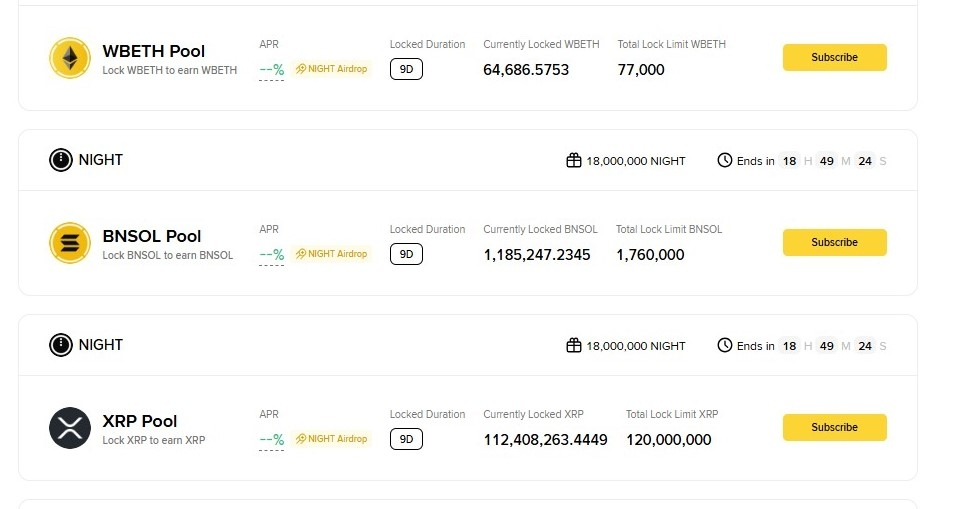 With less than 18 hours remaining, participants still have a narrow window to allocate assets like WBETH, BNSOL, ADA, or XRP into dedicated pools and access a reward pool of up to 120 million NIGHT.