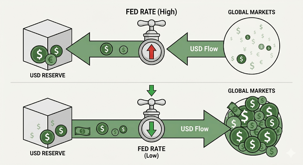 Para entender claramente este mecanismo, você só precisa lembrar de um princípio fundamental: o FED é quem imprime o dólar americano, e a taxa de juros é o "preço do aluguel" desse dólar.
