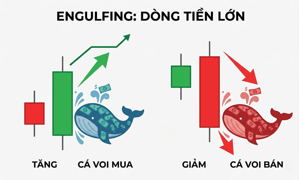Mô hình Nhấn chìm - Engulfing là bằng chứng trực quan nhất cho thấy sự tham gia của dòng tiền lớn.