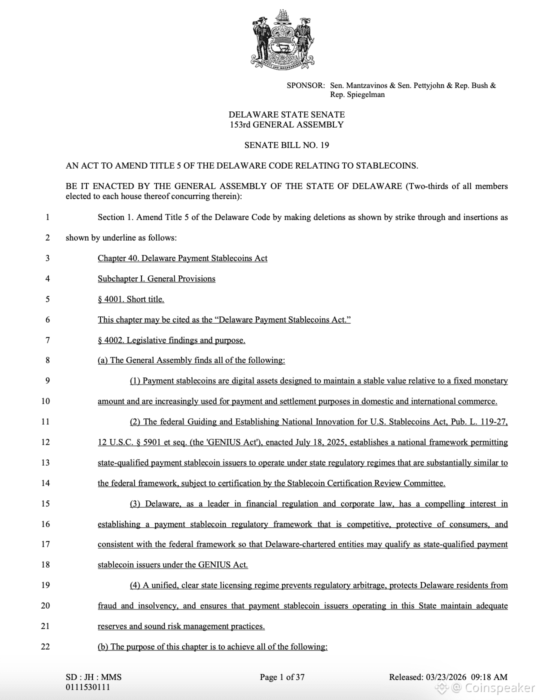 Delaware has officially introduced the Delaware Payment Stablecoins Act (SB 19).