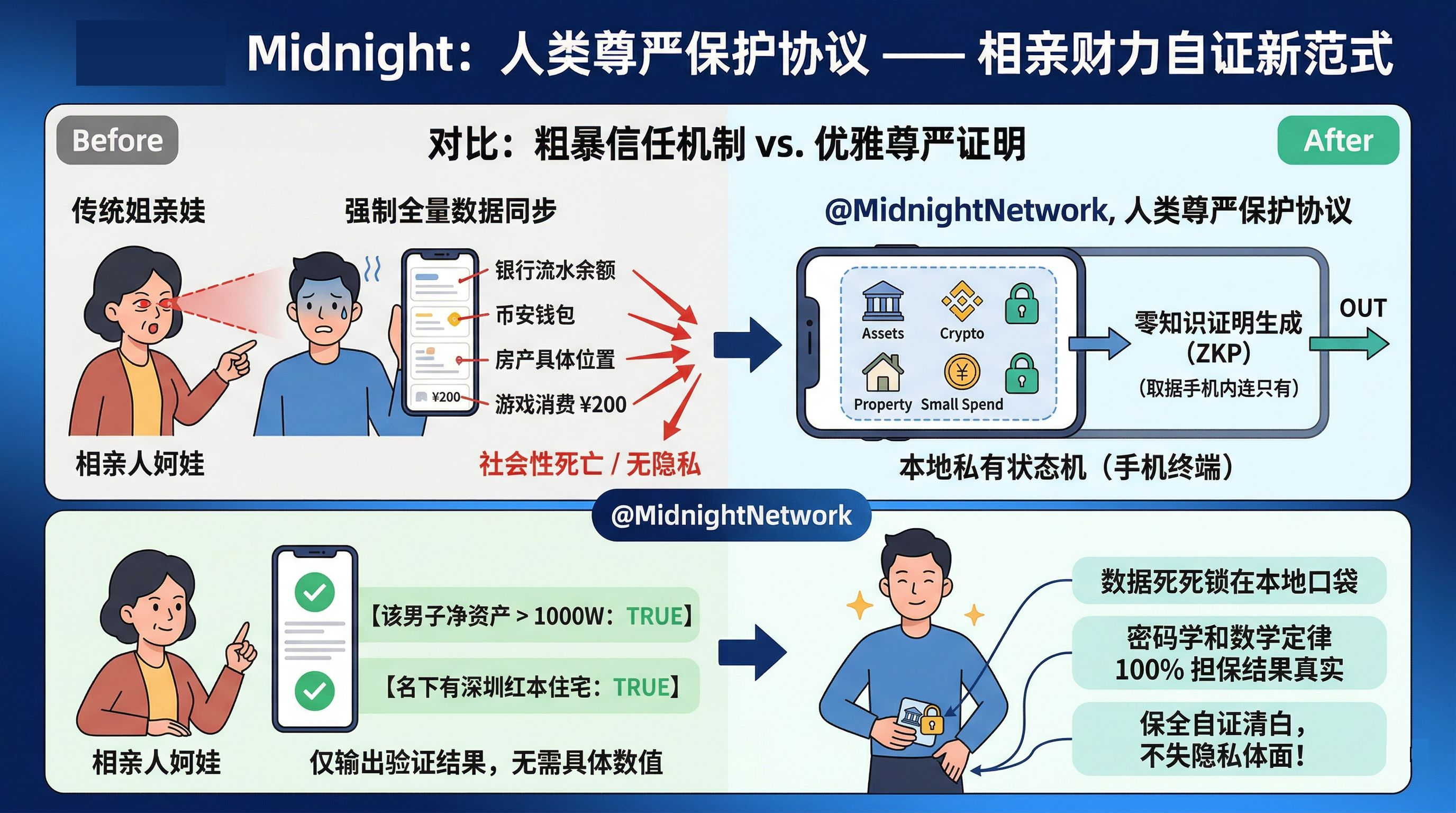 在 Midnight 的宇宙里,如果再去深圳莲花山相亲,我的手机就是个私有状态机。我会用 Compact 语言写一个几行代码的极简电路,它在我的手机本地悄悄读取我的资产数据,然后向阿姨们输出一个零知识证明: