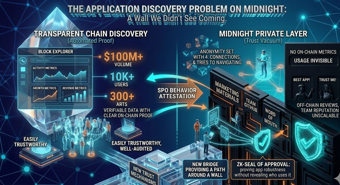 on Midnight the chain cannot provide that signal. the application's usage history is private. its transaction volume is private. its user retention is private. the evidence that would normally build trust in a financial or privacy-sensitive application is exactly the evidence that the privacy model is designed to suppress.