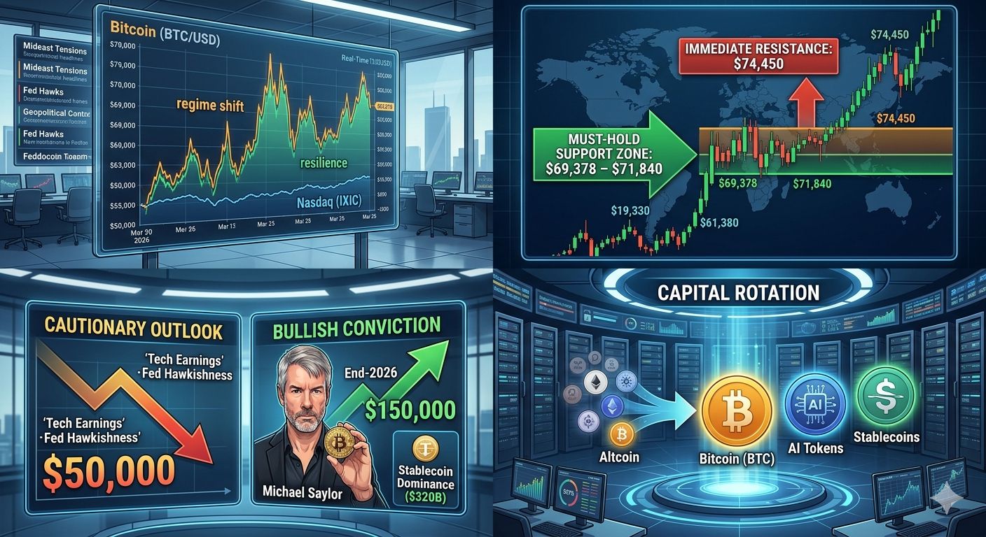 The "Must-Hold" Support Zone: This green band, established between $69,378 and $71,840, is the absolute floor for the current bull thesis. If this level fails, the correction from historical highs could accelerate.