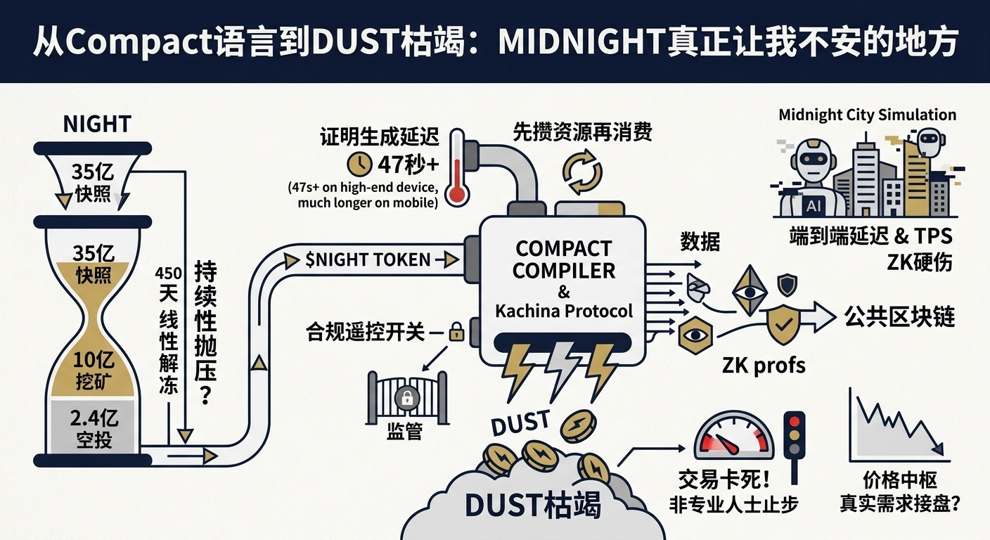 更扎心的是官方那场Midnight City Simulation吹得天花乱坠,用AI Agent模拟全城交易听起来很赛博,但我从代码层面看,这更像在给ZK证明生成时间打马赛克。我们都知道ZK的硬伤从来不是TPS而是端到端延迟,尤其是移动端和低配PC。模拟环境里服务器集群跑几千TPS当然好看,但真等散户拿手机刷个NFT铸造或者隐私投票,Compact编译器+证明生成那套流程会不会直接把普通设备拖成PPT?上次我本地跑了个中等复杂度的零知识投票合约,证明生成花了整整47秒,这还是在M3 Max上——换成普通安卓机呢?这种“实验室数据”到“真实战场”的落差,过去干翻过多少条号称“高性能”的L1,现在Midnight也得自己去撞。