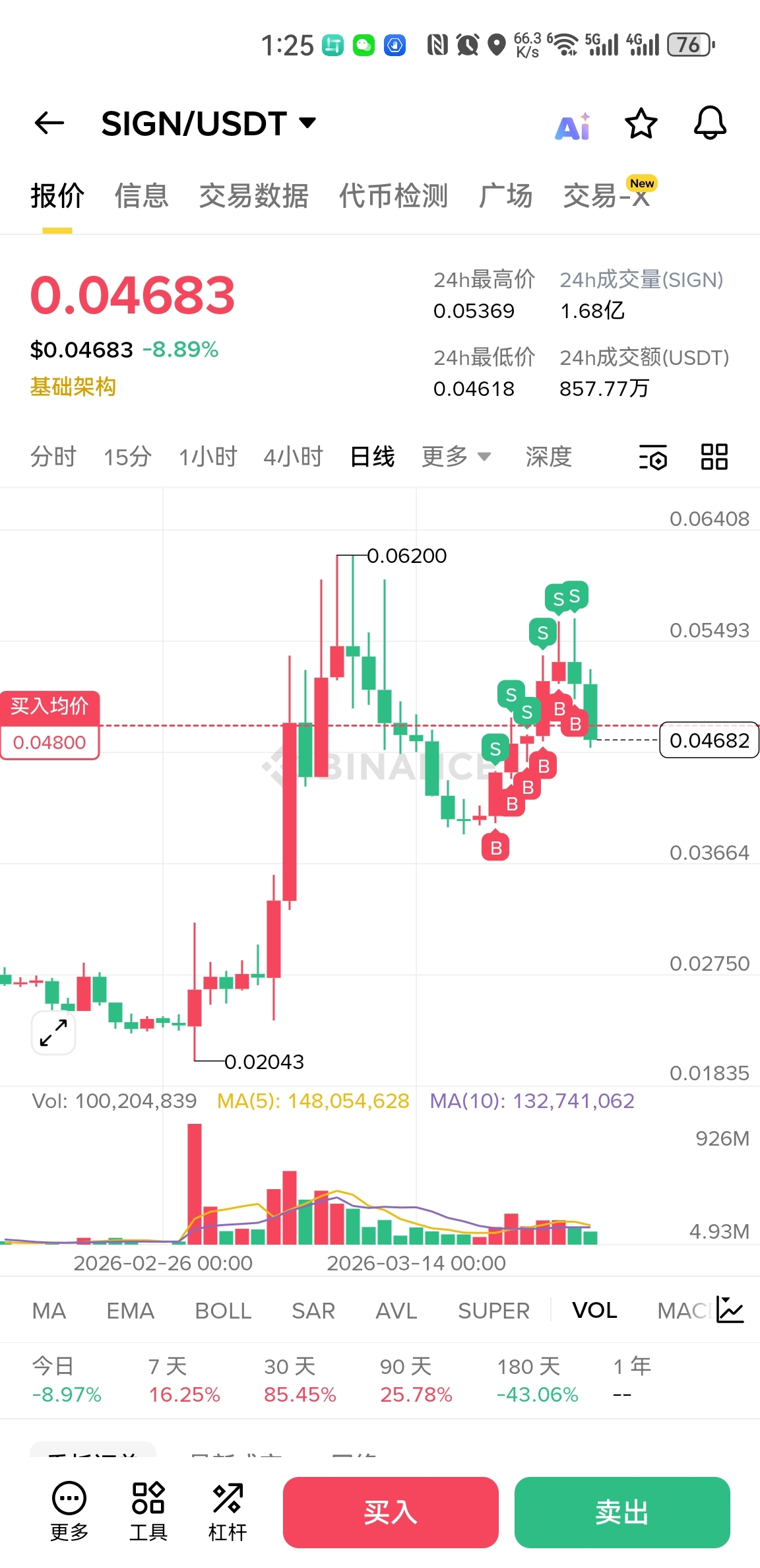 @SignOfficial 刚看了一眼K线,$SIGN今天开盘0.052左右,最高冲到0.05369,最低摸到0.04618,现在在0.04683附近晃悠。看着这根针我血压都上来了。成交量1.68亿枚,857万刀,跌了快9个点。