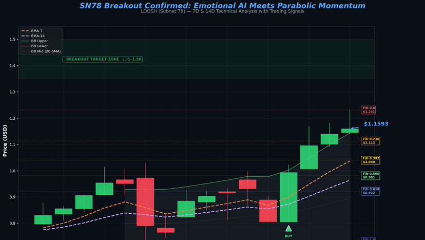 With potential pilot programs on the horizon, SN78 sits at the intersection of two explosive narratives—the Bittensor ecosystem rally (TAO +90% in March, Grayscale ETF filing) and the real-world deployment of decentralized AI (vis a vis Jensen Huang and Chamath talking about Bittensor at the recent NVIDIA conference). If pilot announcements materialize, the current $1.16 price is a floor, not a ceiling. Breakout targets above $1.23 resistance extend to $1.50–$1.75 on a fundamental re-rating, with the Fib 0.236 ($1.113) as the line in the sand for bulls.