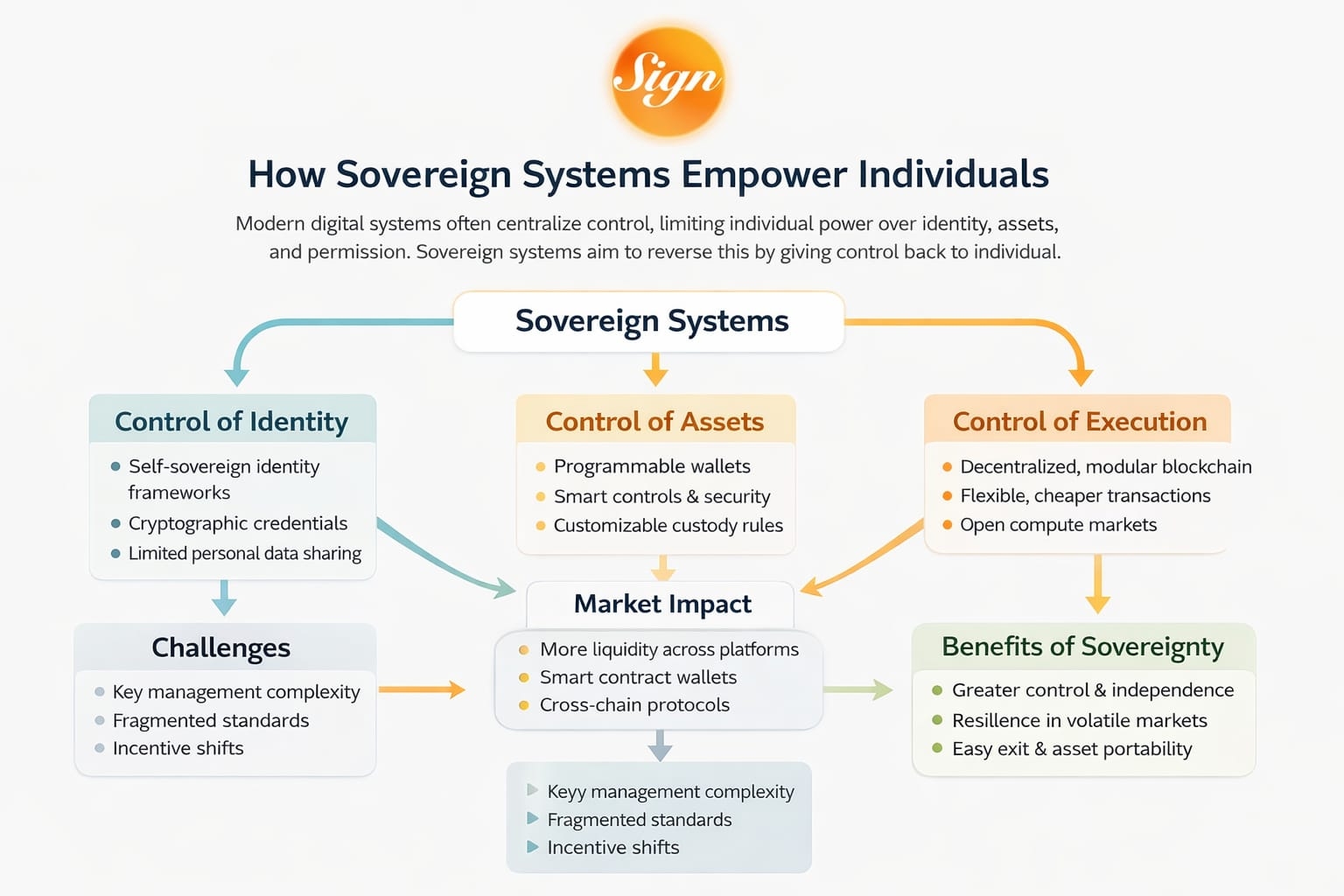 Modern digital systems run quietly in the background, shaping who holds power, often without us even noticing. Every time you log in somewhere, make a transaction, or prove who you are, there’s usually an intermediary in charge someone else gets to decide who gets in, what’s allowed, and how value flows. The issue isn’t just that these systems are centralized. It’s that the power dynamic tilts heavily: you create all this data, but institutions get to verify it, move it, and profit from it. Sovereign systems aim to flip that script. They hand back control of identity, assets, and permissions to the individual.